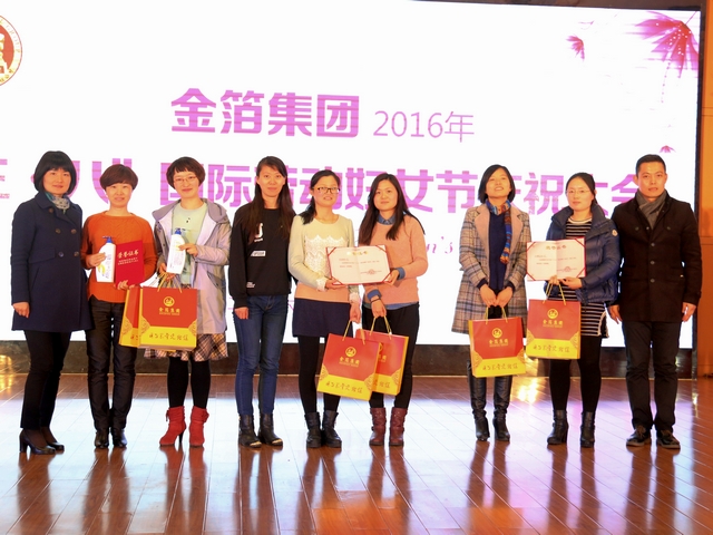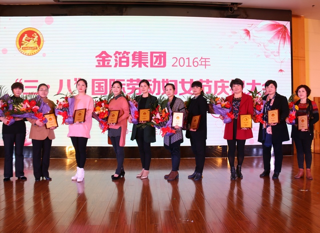 随后,大会向在过去一年中为金箔事业发展作出突出贡献的杰出女性授予“集团2015年度‘十佳妇女’”称号,并进行隆重表彰,她们是冯文婷(金箔文教)、邢川美(金宝商贸)、苏 云(金箔置业)、李 静(集团总部)、邵泽群(金江包装)、范先云(金东海生态农业)、姜友花(金宝商贸)、袁龙珍(金元宝公司)、唐秋芳(鑫元机电)、梁兴惠(金陵金箔)。