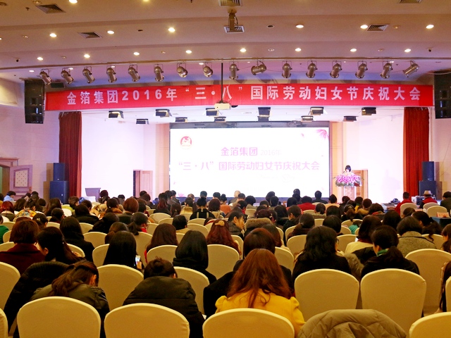 今天下午,一年一度的金箔集团庆祝“三·八”妇女节大会在金元宝大酒店如期举行,来自集团各条战线上的近400名女职工代表欢聚一堂,载歌载舞,共同度过一个温馨而难忘的节日。集团董事局江主席带领各大公司领导一同出席,与广大女同胞们共庆佳节。