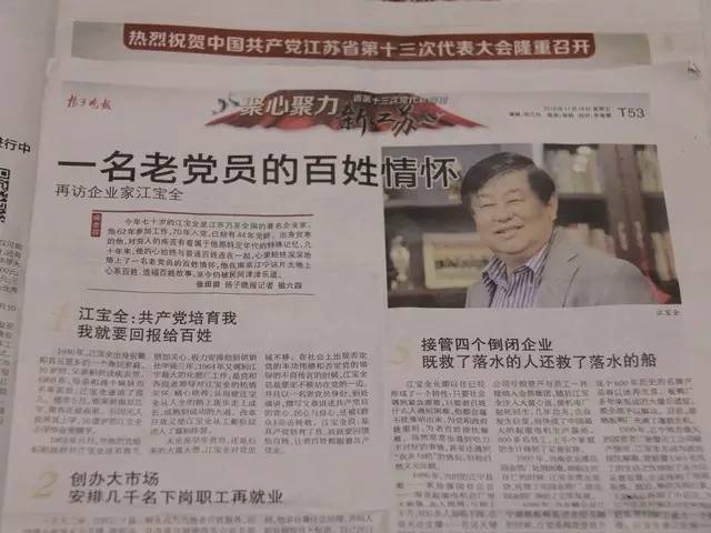 今天上午,江苏省第十三次党代会正式开幕,伴随各位代表一同走进会场的还有《扬子晚报》党代会特刊。特刊以《一名老党员的百姓情怀》为题,对集团董事局江主席进行整版专题报道。